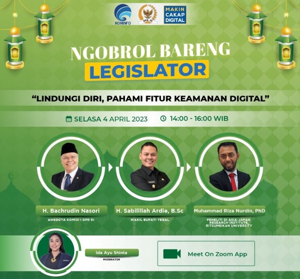 JAKARTA, AKURATNEWS – Kementerian Komunikasi dan Informatika (Kementerian Kominfo) bersama Dewan Perwakilan Rakyat (DPR) telah menyelenggarakan seminar online yakni Ngobrol Bareng Legislator dengan mengusung tema: “Lindungi Diri, Pahami Fitur Kemanan Digital”. Seminar diselenggarakan pada hari Selasa, 04 April 2023 melalui platform zoom meeting.