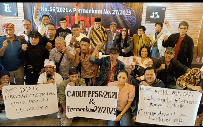 JAKARTA, AKURATNEWS.co – Ari Bias, dan puluhan pencipta lagu lintas genre dan lintas LMK berkumpul dalam diskusi bertajuk “Pencipta Lagu Menggugat PP 56 2021 dan Permen 27 2025″.