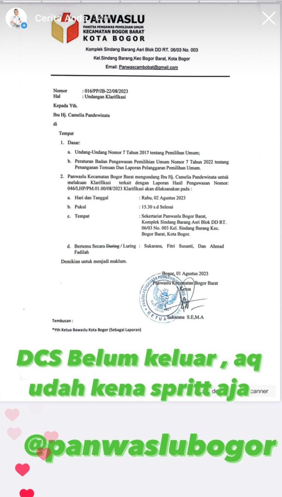 “DCS Belum keluar, aq udh kena spritt aja” tulis Camel di story berlatar belakang surat panggilan serta menandai @panwaslubogor pada story tersebut.