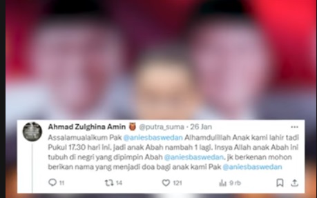 Akun @putra_suma awalnya mencuit “Assalamualaikum Pak @aniesbaswedan Alhamdulillah Anak kami lahir tadi (Jumat, 26/1) Pukul 17.30 hari ini”.