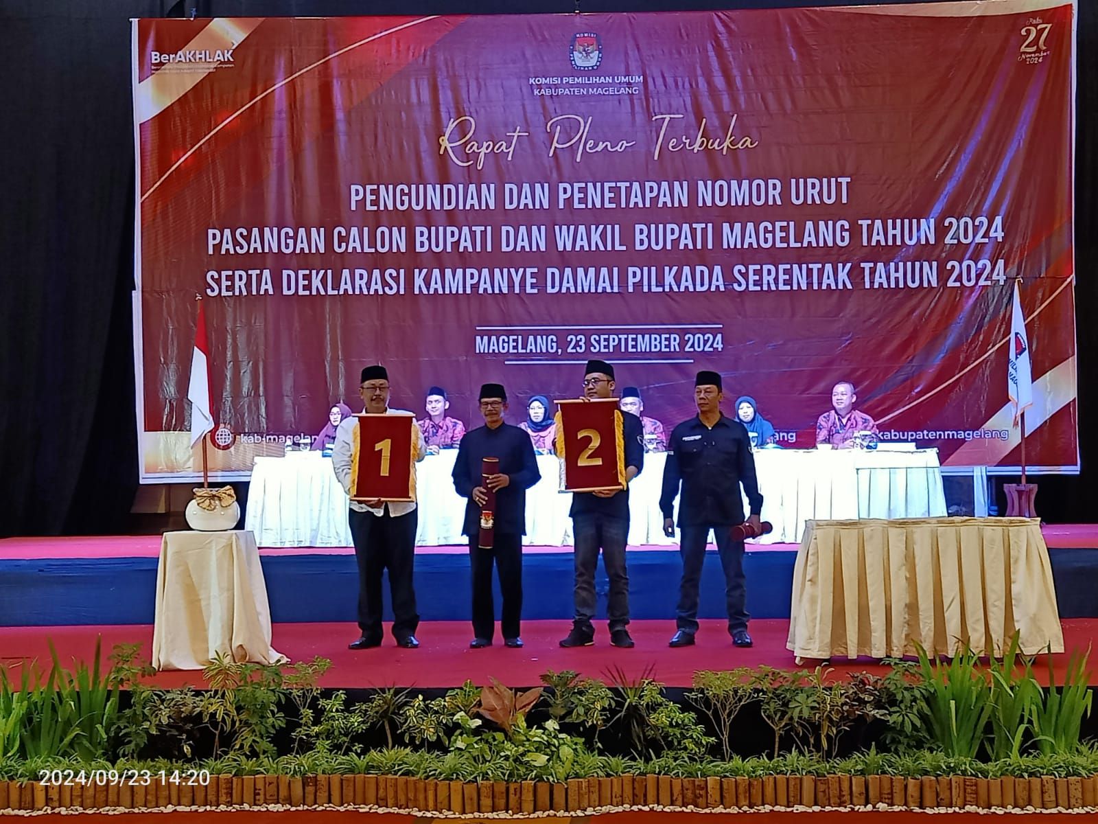 Hal tersebut merupakan hasil dari Rapat Pleno Terbuka Pengundian dan Penetapan Nomor Urut Pasangan Calon Bupati dan Wakil Bupati Magelang serta Deklarasi Kampanye Damai Pilkada Serentak Tahun 2024 di Ballroom Grand Artos Hotel, Senin (23/9/2024).