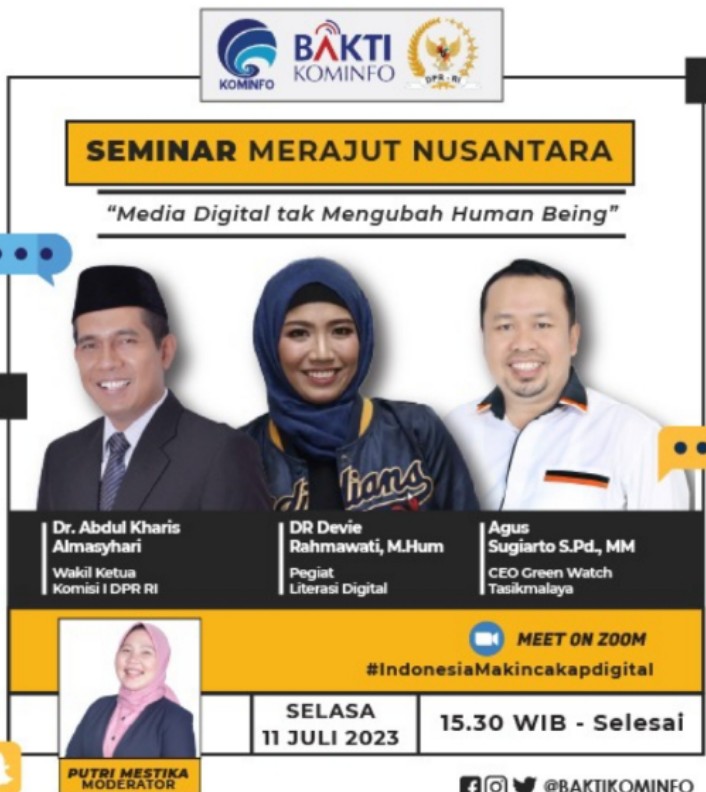 JAKARTA, AKURATNEWS – Kementerian Komunikasi dan Informatika (Kementerian Kominfo) bersama Dewan Perwakilan Rakyat (DPR) telah menyelenggarakan seminar online dengan tema yang diangkat “Media Digital tak Mengubah Human Being”. Seminar ini diselenggarakan pada hari Selasa, 11 Juli 2023 melalui platform zoom meeting.