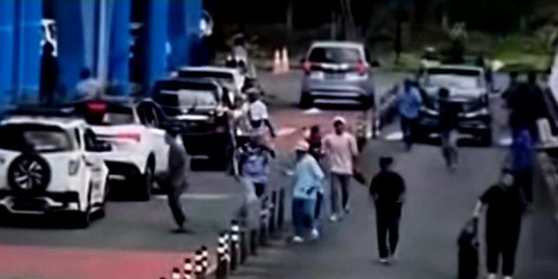 Namun situasi berubah cepat ketika seorang pria tak dikenal, mengenakan jaket merah dan masker, mendekat lalu langsung menyerang dengan senjata tajam.