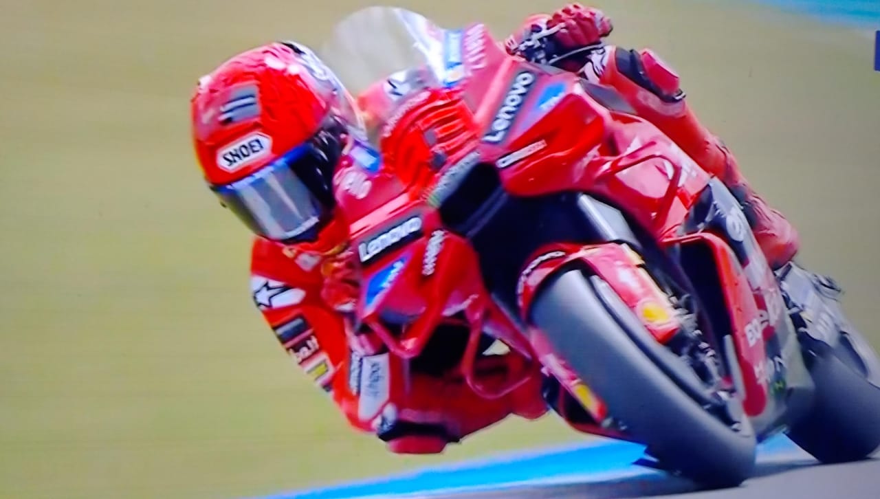Marc yang sebelumnya membuntuti Bagnaia, berhasil menyalip dari sisi dalam di tikungan terakhir memasuki lap keenam. Namun, saat itu jaraknya masih dekat.