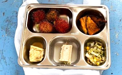 Terlihat, menu MBG siswa SMAN 10 Surabaya pada Senin (10/2) adalah ubi panggang, tahu, fish cake, oseng sayur dan buah rambutan. Tidak tampak nasi dan susu.