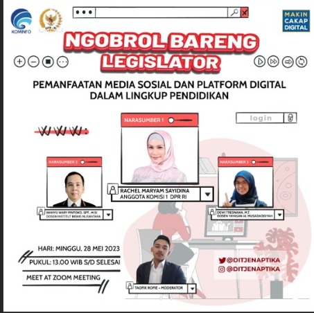 JAKARTA, AKURATNEWS – Kementerian Komunikasi dan Informatika (Kementerian Kominfo) bersama Dewan Perwakilan Rakyat (DPR) telah menyelenggarakan seminar online Ngobrol Bareng Legislator pada Minggu, 28 Mei 2023 dengan mengusung tema: “Pemanfaatan Media Sosial dan Platform Digital dalam Lingkup Pendidikan”.