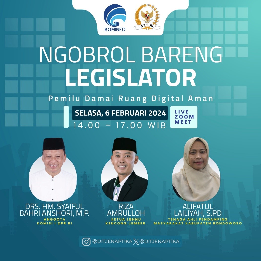 Dalam seminar Ngobrol Bareng Legislator ini terdapat empat narasumber yang berkompeten pada bidangnya, yaitu Bapak Drs. HM. Syaiful Bahri Anshori, M.P yang saat ini menjabat sebagai Anggota Komisi I DPR RI. Narasumber kedua yakni Bapak Semuel Abrijani Pangerapan, B.Sc selaku Dirjen Aplikasi Informatika Kementerian Kominfo RI serta megundang Bapak Riza Amrulloh selaku Ketua LBHNU Kencong Jember. Selain itu, dalam acara ini juga turut mengundang Ibu Alifatul Lailiyah, S.Pd selaku Tenaga Ahli Pendamping Masyarakat Kabupaten Bondowoso.