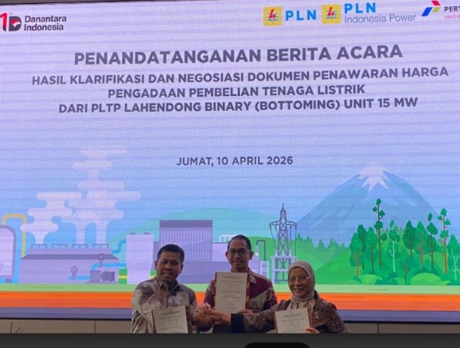 BANDUNG, AKURATNEWS.co – Konsorsium PT Pertamina Geothermal Energy Tbk (PGE) (IDX: PGEO) dan PT PLN Indonesia Power (PLN IP) mencapai kesepakatan tarif listrik dengan PT PLN (Persero) untuk pengembangan proyek Pembangkit Listrik Tenaga Panas Bumi (PLTP) Lahendong Bottoming Unit berkapasitas 15 megawatt (MW). Kesepakatan tersebut ditandai dengan penandatanganan Berita Acara Kesepakatan Tarif yang dilaksanakan di Bandung, Jawa Barat, pada Jumat (10/4/2026).