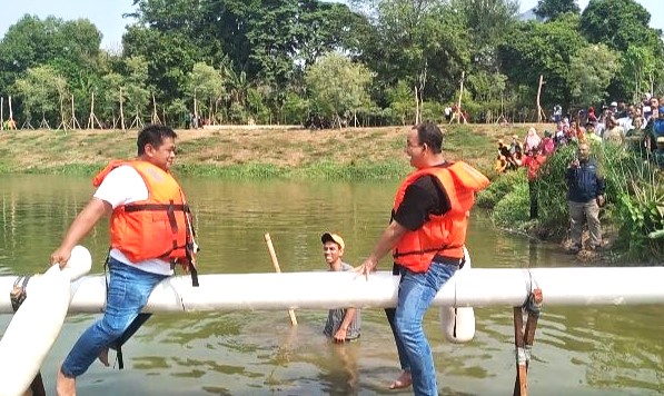 Usai lomba pukul bantal, Anies beserta keluarga melepas benih ikan Nila ke Waduk Lebak Bulus. (NVR)