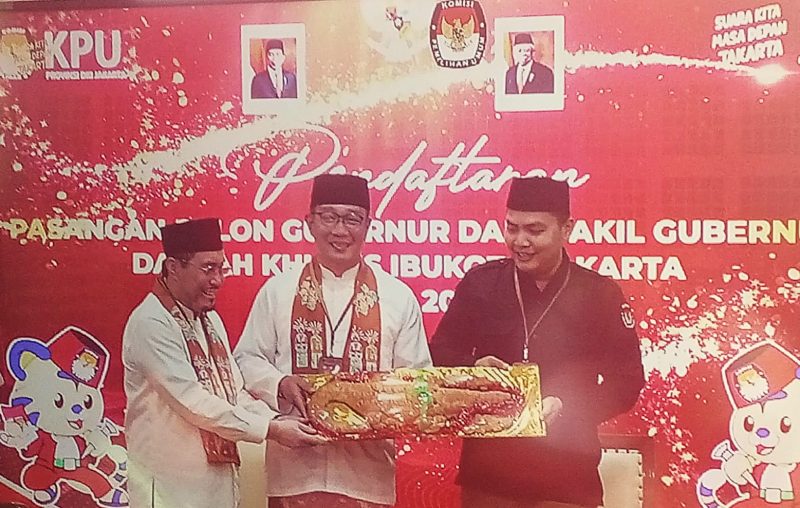 “Mudah-mudahan kombinasi ini memberikan keyakinan kepada warga Jakarta,” ucap RK yang dalam kesempatan pendaftaran ini menyerahkan cinderamata berupa roti Buaya kepada Ketua KPU Jakarta, Wahyu Dinata. (NVR)