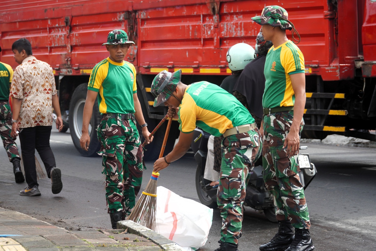 Prajurit TNI bersama petugas DLH dan para pelajar tampak penuh semangat membersihkan sampah, merapikan lingkungan, serta memastikan area fasilitas umum dalam kondisi bersih dan nyaman bagi masyarakat.