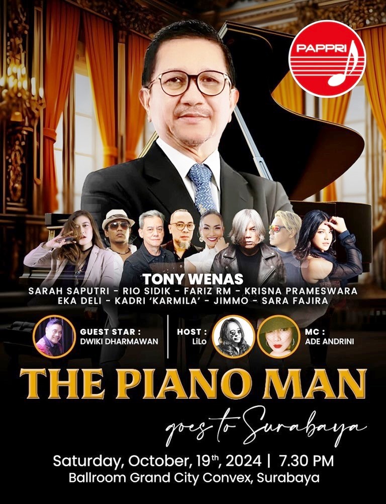 “Semoga konser tunggal saya di Surabaya ini kembali mengukir prestasi, agar bisa dikenang sebagai salah satu persembahan terbaik dari sebuah konser musik di Indonesia,” ungkap Tony Wenas penuh harapan, yang saat ini tengah mempersiapkan dirinya secara total, agar bisa tampil prima dalam Konser The Piano Man, pada tanggal 19 Oktober 2024, pukul 19.30 WIT, di Ballroom Grand City Convex, Surabaya./Ib