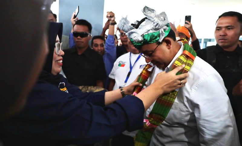 Setibanya di Bandara Haluoleo, Selasa (9/1), Anies disematkan sarung adat dan topi adat Kesultanan Buton yang disebut Kampurui oleh Ketua Tim Kampanye Daerah (TKD) Sulawesi Tenggara, Ali Mazi.