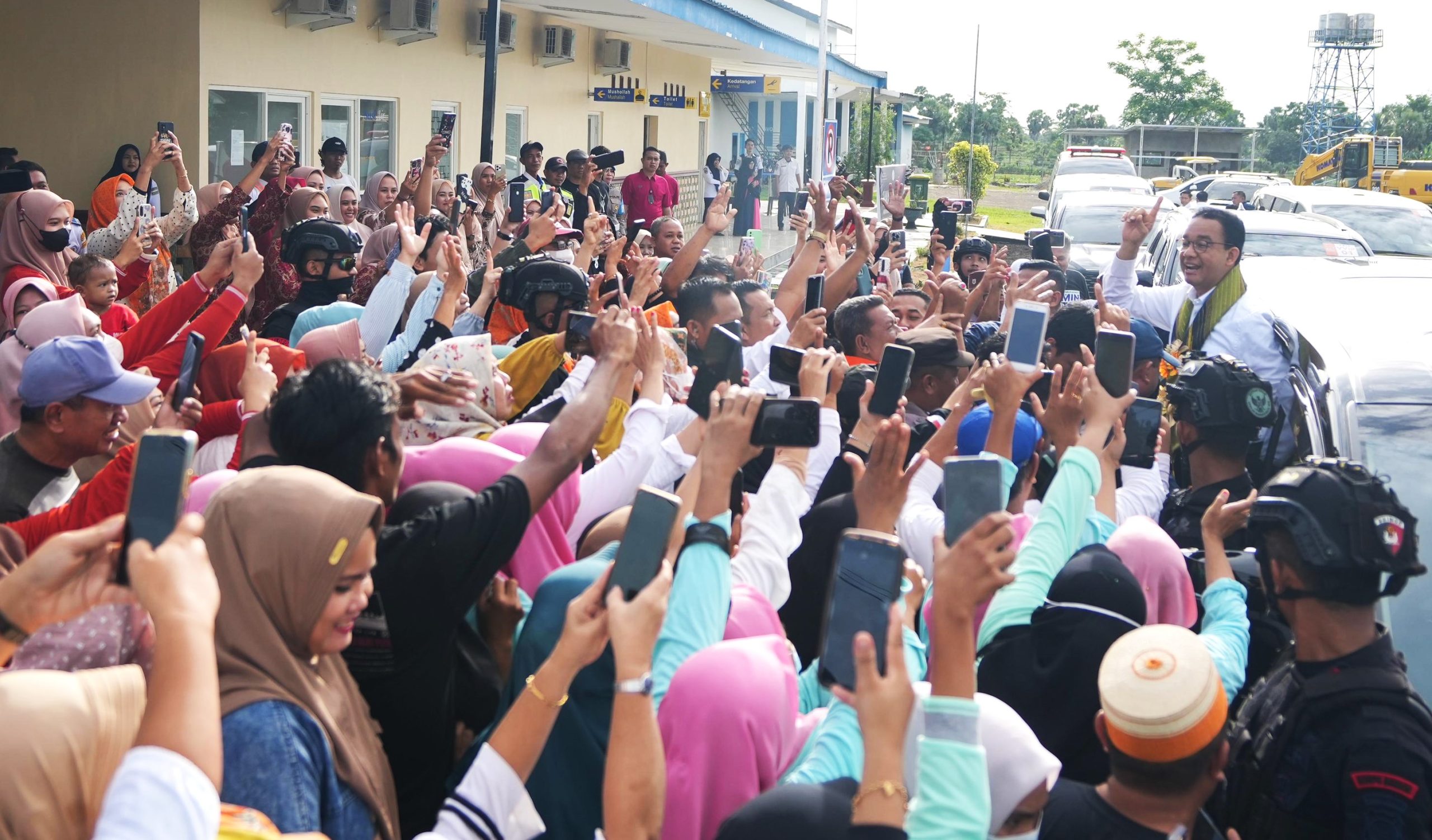 Kedatangan Anies disambut antusiasme dari masyarakat Bone yang memadati Bandara Arung Palakka, Bone, Rabu (17/1).