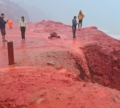 Pantai Silver dan Red di Pulau Hormuz, Teluk Persia, tampak berubah menjadi merah terang setelah diguyur hujan lebat. Dalam rekaman tersebut, terlihat air berwarna merah mengalir dari tebing pantai ke laut di tengah derasnya hujan, sementara wisatawan berjas hujan berkumpul untuk menyaksikan kejadian ini.