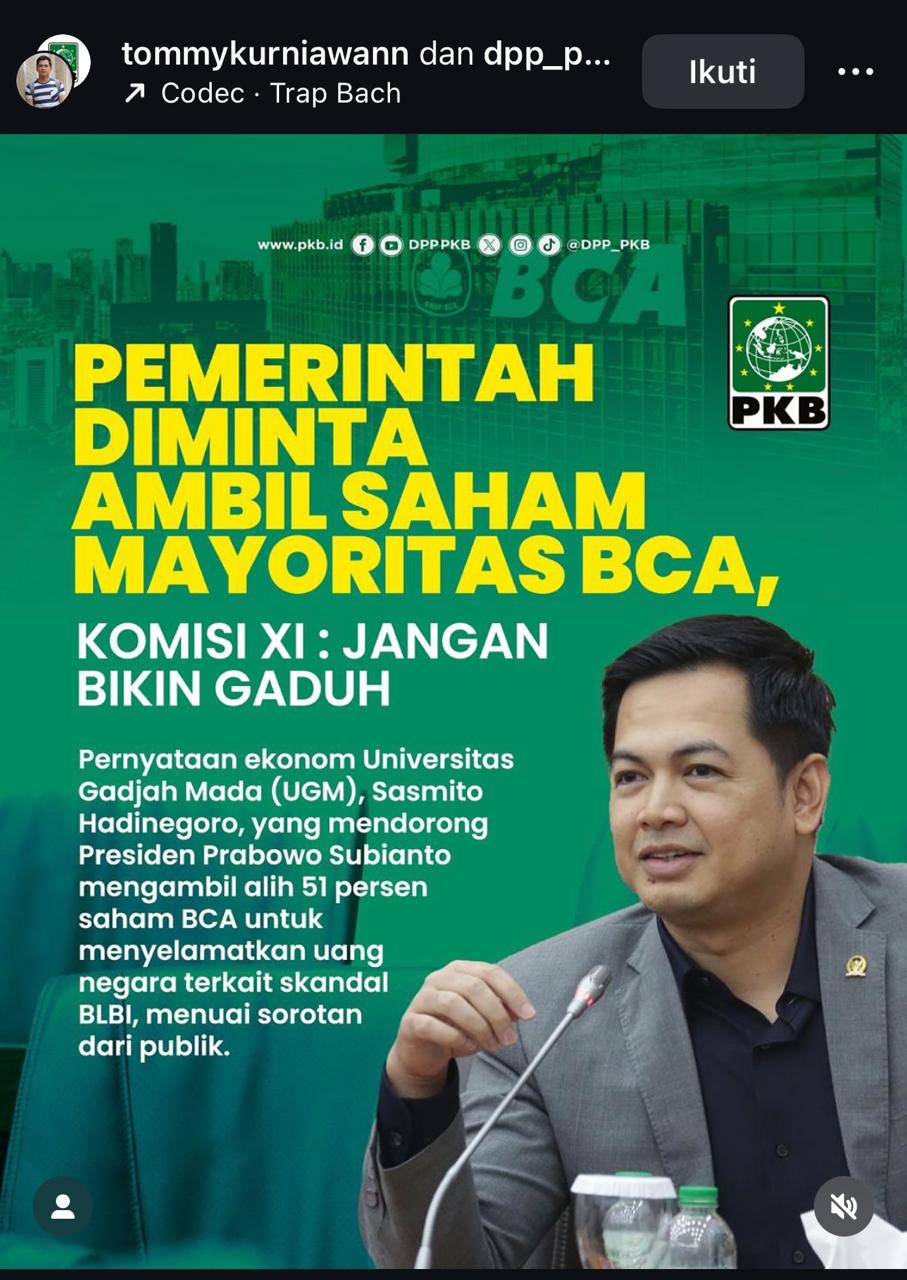 Ia menegaskan bahwa pemerintah dan pihak terkait sudah lama membahas persoalan BLBI, termasuk kewajiban pengembalian aset dan penyelesaian hukum. Mengaitkannya kembali dengan kepemilikan saham BCA, menurutnya, justru kontraproduktif.
